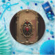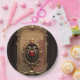 Elegante emblema de lujo del corazón. El diseño tiene un marco dorado ornamentado con arcos en un fondo marrón degradado. El marco está muy bien decorado con flores de estilo barroco. Desde la parte superior del arco se colgan delicadas cadenas doradas con lágrimas. En el centro inferior, un marco dorado más pequeño, de estilo similar, muestra un emblema rojo del corazón flanqueado por serpientes aladas. El ambiente general es lujoso y decorativo.