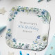 Las alegres flores blancas de peonía y las hojas de acuarela verde forman un hermoso borde en los platos de la fiesta de cumpleaños floral azul bonito. Una moda, un guión moderno escrito a mano en una decoración personalizada para el brunch del jardín o el fiesta de té.