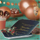 Delicados, sofisticados y llenos de elegantes platos de fiesta de graduación con un arreglo floral simple pero hermoso en la esquina inferior izquierda con hermosas flores rojas y exquisitos botánicos verdes. Elegante tipografía de personalizable dorado para los detalles del evento sobre un gradiente azul medianoche para el fondo.