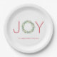 Elegante plato de papel de vacaciones con "JOY" con las letras "J" e "Y" en un tipo de letra rojo sans serif y una fuente de color de agua pintada de verde como la letra "O". Debajo hay una plantilla para el texto de su personalizado. Estas placas de papel son perfectas para añadir un toque personal a su fiesta de Navidades. Elementos de coordinación disponibles en la colección completa. Si necesitas ayuda para encontrar la colección, no dudes en enviarme un mensaje.