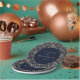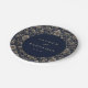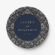 Este elegante plato de boda presenta un sofisticado fondo azul marino adornado con patrones florales intrincados y repetitivos en un estilo de damasco lujoso. El diseño circular central muestra texto personalizable en una fuente serif clásica, enmarcado por un borde doble delgado para un aspecto pulido. La estética general es atemporal y refinada, perfecta para celebrar su día especial con un aire de sofisticación y elegancia natural. Ideal para ocasiones formales, este diseño combina motivos tradicionales con claridad moderna para crear un ambiente de mesa memorable.