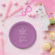 Platos de papel simplistas con una elegante flor de orquídea sobre un fondo violeta sencillo y audaz. Personalice este diseño femenino mínimo añadiendo el nombre de la chica fiesta.