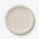 Elegantes platos de papel de fiesta con patrón geométrico triangular blanco y dorado.