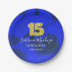 Celebre su elegante Quinceañera azul real con un plato de papel azul personalizado. El purpurina de oro Glitzy número 15 es hermoso sobre el fondo azul de los rosas. El elegante plato personalizado azul Quinceanera es versátil para los temas de fiesta de 15 años azul real o azul zafiro.
