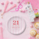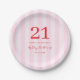 Crea tus propias invitaciones personalizadas de 21 años con tipografía moderna y fondo rayado de patrón rosado