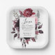Los elegantes platos de papel para bodas representan una hermosa acuarela floral, un diseño de marco moderno con una rosa rosa oscuro y un follaje gris oscuro. Presenta los nombres de la pareja y una parte de Versos de la Biblia Cristiana 1 Corintios 13:7-8, "AMOR... espera todas las cosas, soporta todas las cosas, el amor nunca falla".
