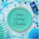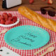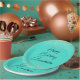 Estos platos, de tipo fiesta o evento, presentan una temática elegante y clásica con un fondo turquesa o verde azulado. El saludo "Feliz Cumpleaños" se imprime en una fuente de escritura negra a través del centro, seguido de un nombre de ejemplo en una fuente de escritura coincidente. Puede personalizar la placa para incluir su propio nombre personalizado u otro texto. El confeti de purpurina de oro representa la parte superior e inferior de la placa.