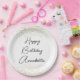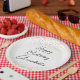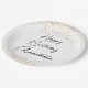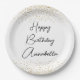 Estos platos para eventos o fiestas presentan una temática elegante y clásica sobre un fondo blanco. El saludo "Feliz Cumpleaños" se imprime en una fuente de escritura negra a través del centro, seguido de un nombre de ejemplo en una fuente de escritura coincidente. Puede personalizar la placa para incluir su propio nombre personalizado u otro texto. El confeti de purpurina de oro representa la parte superior e inferior de la placa.