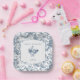 Elegante y ornamentado patrón de fondo vintage azul y blanco toile de jouy con flores exóticas, viñas y follaje entrelazados con guirnaldas y canastos de rosas con etiqueta esculpida personalizado, ramo de flores y campos de texto. Compra productos coincidentes en colecciones en la tienda Grafixmom.