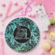 Un elegante y dramático patrón floral negro sobre un fondo azul turquesa para el contraste, luego un círculo negro en el medio con un guión elegante donde puede personalizar su evento con una letra, nombre o logotipo para hacerlo único propio. Parte de la colección de flores negras de la Moda