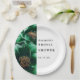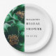 Estas elegantes platos de papel para ducha nupcial con flores verdes esmeralda y doradas pueden ser personalizadas con su información en tipografía moderna. Diseñado por Thisisnotme©