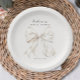Diseño simple de lazo blanco en platos de papel para duchas de novia.