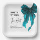 Completa tu celebración con estos platos de papel para Bridal Shower con lazo turquesa "She's Tying The Knot", diseñados para brindar elegancia sin esfuerzo y estilo moderno a las fiestas de bridal shower, fiestas de compromiso, celebraciones de despedida de soltera y eventos de fin de semana de boda.