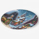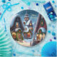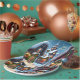Esta encantadora casa de papel alberga un pueblo de nieve con casas decoradas con Navidades por la noche. Calles y techos están densamente cubiertos de nieve, las ventanas están iluminadas, la decoración navideña consiste de abetos y bolas rojas de árbol de Navidad. ¡Placas de papel personalizado para su Fiesta Navidad!