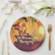 El hermoso plato de papel inspirador de Thanksgiving muestra una hermosa exhibición de las hojas caídas y presenta la Biblia Verse Salm 95:2, "Entremos en su presencia con el Día de Acción de Gracias".