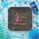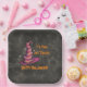 Un divertido plato de papel cuadrado con un gorra de brujas flotante, rosa y naranja, que dice "Es la época de brujas del año, Feliz Halloween" en un oscuro fondo negro de carbón vegetal.