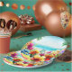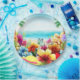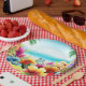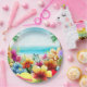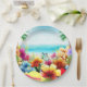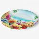 Este plato de papel tiene un diseño divertido para el verano, con una escena de playa con flores, mariposas, palmeras y la playa y el océano al fondo. Esto sería muy útil para cualquier fiesta de verano o picnic.