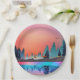 Placas de papel con un bonito diseño gráfico con un tranquilo lago de ciervos y altos pinos reflejados en el agua. Las estrellas se ciernen sobre sus cabezas.