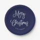 Estas placas de papel del día de fiesta simple y de moda dicen "Felices Navidad" en la escritura manuscrita rústica, blanca en una oscuridad, fondo de los azules marinos.