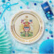 El escudo de armas de Canadá está infundido en forma de círculo dorado falso y se coloca entre ramas falsas de laurel de oro.