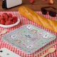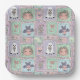 Espíritus caprichosos en papel de los sueños pasteles Plate Un delicioso tapiz de cuadrados y rectángulos de colores pastel, cada uno con una divertida viñeta de personajes y motivos de estilo personalizado. Fantasmas agarrando flores, murciélagos con estrellas y rostros durmientes serenos con cerraduras de rizo mezclados con arcos y arreglos florales. La paleta (rosa suave, púrpura, verduras de menta y azul) evoca una atmósfera soñadora y suave.