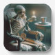 Un esqueleto se sienta en un sillón gastado sosteniendo un quequito con una vela de cumpleaños iluminada para una fiesta de cumpleaños de Halloween. El texto puede cambiarse o eliminarse