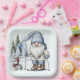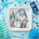 Un gnomo con barba blanca que lleva un gorra de invierno azul y sujeta postes de esquí se alza sobre el terreno nevado junto a un conejo vestido con una bufanda roja.