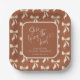 Está Atando el Nudo Personalizado Ducha de Novia Platos de Papel en Terracota + Paleta de Arena. Estilo de escritura a mano elegante con un patrón de lazo lindo. Simplemente personalice la plantilla con el título de su evento y la fecha. © Kimbellished, LLC