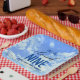 ¡Está en la Nueve Nube! Ducha nupcial/productos de tocador con nubes blancas onduladas contra un cielo azul intenso.