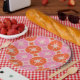 Este es un elegante patrón de estrenos atómicos blancos modernos de mediados de siglo en círculos rosados y naranjas. Es un gran regalo para todos los amantes de los diseños decorativos de los años 50 y 60
