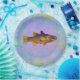 Un ilustracion vintage de un pez hecho en pluma y tinta con colores marrones antiguos. Está situado sobre un fondo violáceo con aspecto de capilla. Un plato de papel fresco para celebraciones y actividades relacionadas con el pescado.