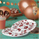 Estas lindas placas de papel con temática de fútbol presentan una "explosión" de pelotas de fútbol blanco y marrón de tamaño variado y formas estrellas de estilo cómico marrón y gris - personalizadas con tu mensaje de cumpleaños - de katz_d_zynes