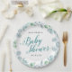 Bonito y delicado plato de ducha para bebés con delicadas hojas de eucalipto acuarela en blues y verdes. La frase "baby ducha" es de estilo moderno caligrafía verde azulada, personalizada con el nombre de la futura madre y fecha en sans serif negro.