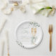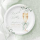 Celebrate the bride-to-be with a delightful 'Brunch & Bubbly' bridal shower theme. These paper plates feature a charming watercolor illustration of a champagne flute adorned with a soft green ribbon, surrounded by delicate eucalyptus leaves and tiny white blossoms.