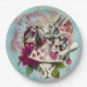 Placas de papel con la versión coloreada de Alicia en el Conejo Blanco de la Tierra de las Maravillas como miembro de la Corte de la Reina de los Corazones. Añadido floral sobre fondo azul angustiado. Perfecto para fiestas de té Mad Hatter y otros eventos caprichosos.