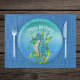 Este plato de papel tiene una criatura dragón marino de fantasía azul acuática con cuernos blancos envueltos en algas verdes en tonos de azul acuoso con burbujas de agua. Personalizar el texto Feliz Cumpleaños con las plantillas.