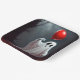Una figura fantasmal sostiene un globo rojo brillante en un bosque oscuro y espeluznante con árboles retorcidos