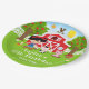 Este lindo y divertido plato cuenta con un chica de pelo negro con piel clara al lado de un granero rojo con una vana de viento de gallo. Hay animales de granja adorables como una vaca, un cerdo y una gallina. En el fondo hay un cielo azul brillante, manzanos, sol, mariposas y margaritas. El texto combina tipos de letra negrita y sans serif para un aspecto elegante y moderno. Es perfecto para una fiesta de cumpleaños con temática de granja.