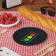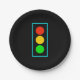 Audaz representación gráfica de la luz de señal de control de tráfico, en rojo, amarillo y verde, con borde azul claro, en fondo negro.