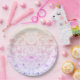 Paper plates with a faux glitter and sequin design in purple, pink, yellow ombre. Perfect for parties, baby showers, easter celebrations and more!