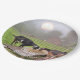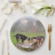 Estos platos de papel presentan cabras felices comiendo su cena al atardecer.