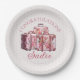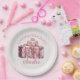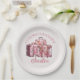 Platos de papel de ducha de fiesta/dormitorio para chicas con maletas de color rosa sobre un fondo de punto de polka rosa suave. El texto dice: "Felicitaciones". Personalice agregando el nombre de su graduada en su camino a la universidad. Perfecto para la graduación o el fiesta del maletero. Comuníquese conmigo para obtener ayuda con sus personalizaciones o para solicitar productos adicionales de correspondencias o coordinación de Zazzle para su evento.