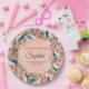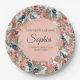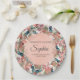 Elegante color de agua rosa botánico y verde azulado floral y deja platos de papel de fiesta de graduación con tema de jardín para chicas personalizados con su nombre, nombre de escuela y año de graduación.
