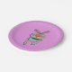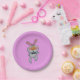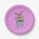 Este plato de papel es de color rosa bonito con un conejo blanco feliz que da un signo de aprobación hacia arriba usando una corbata de arco negro con orejas y mejillas rosas.