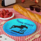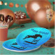 Feliz Cumpleaños Caballo Hunter Jumper Ecuestre - Diseñado sobre un fondo acuático, impresionante silueta de caballo y jinete que va sobre un salto vertical. El diseño dice Feliz Cumpleaños en la parte superior y puede ser personalizado con el nombre de su jinete en la parte inferior.
