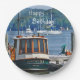 Estas placas de papel de cumpleaños incluyen un barco en el puerto deportivo de Essex Connecticut...con veleros y colinas New england en el fondo. Este astillero se encuentra en el río Connecticut.