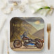 Estas placas de papel de cumpleaños tienen una motocicleta con un fondo natural dramático.