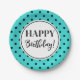 Felices platos fiestas de cumpleaños con un patrón turquesa de puntos de polka negro.