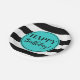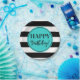 fiestas de feliz cumpleaños con rayas turquesas en blanco y negro.
