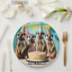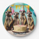 Aquí están cuatro suricatas, tres con sombreros de cumpleaños y de pie detrás de una tarta de cumpleaños con las palabras Feliz Cumpleaños.